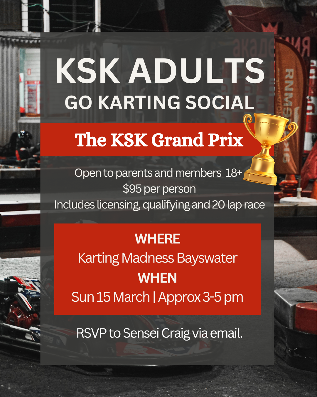 Sunday March 15th - KSK Grand Prix, Adults only, please RSVP direct to Sensei Craig just click this link: craigcatania@gmail.com